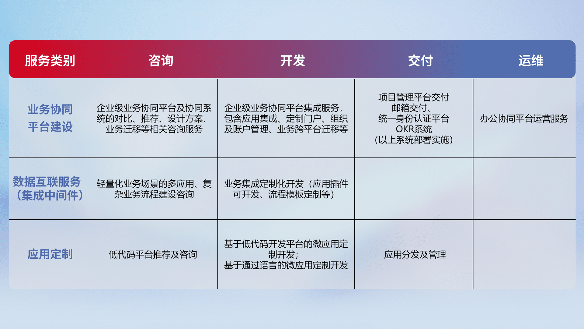 针对钉钉、、、、企微、、IDaas等平台级产品提供产品的规划、、、、方案、、、、交付、、、、定制化开发等服务,,实现如统一协同办公、、、、智能客户服务、、混合会议管理、、、智能数据查询、、、、等业务场景,,,实现数字化转型。。。